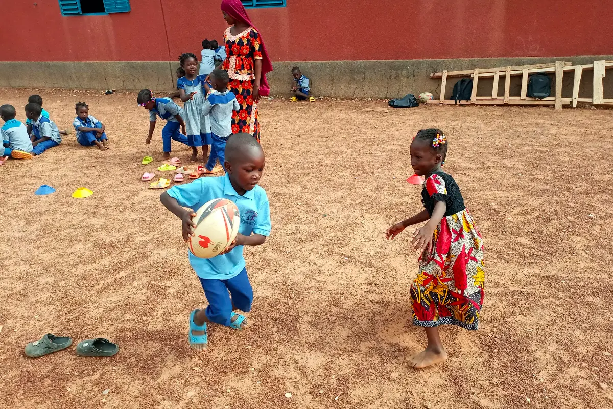 Formation des enseignants : La formation s’est déroulée dans les centres de Polesgo et Pabré en présence de tous les éducateurs. Les échanges en salle ont porté sur le pouvoir éducatif du sport, les enjeux de l’éducation au développement durable par le sport, les principaux besoins de la catégorie d’âge de 3 à 6 ans et les principes de base de la pratique du rugby et de la balle ovale.